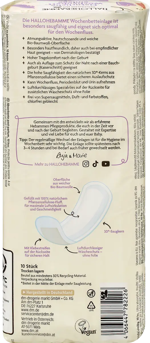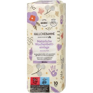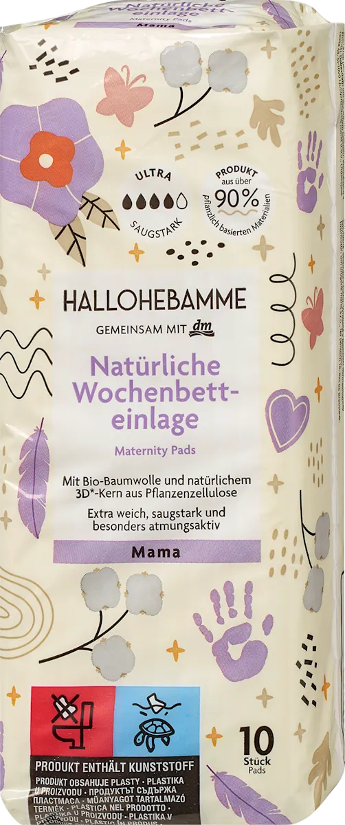 Hallo Hebamme Wochenbetteinlagen Natürlich is een speciaal ontwikkeld kraamverband dat voldoet aan de behoeften van vrouwen in de eerste dagen na de bevalling. Dit maandverband is extra groot, ademend en gemaakt van natuurlijke materialen – zonder plastic op de huid.
