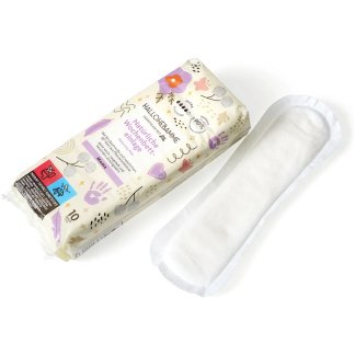 De verpakking bevat 10 stuks natuurlijk kraamverband van Hallo Hebamme.