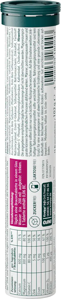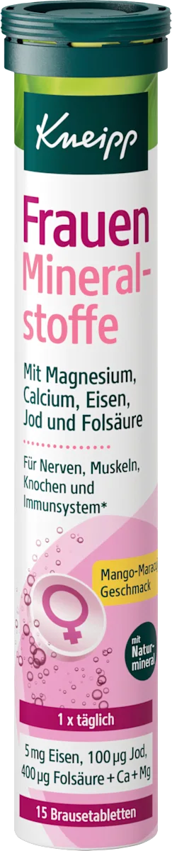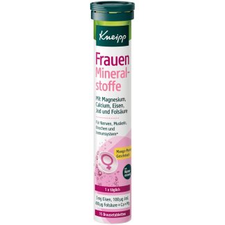 Kneipp vrouwen mineralen bruistabletten zijn speciaal ontwikkeld om te voorzien in de dagelijkse mineralenbehoefte van vrouwen. Deze suikervrije tabletten bevatten ijzer, jodium en foliumzuur – voedingsstoffen die belangrijk zijn voor het energieniveau, de hormonale balans en de stofwisseling. De tabletten lossen gemakkelijk op in water en hebben een verfrissende frambozen- en cranberrysmaak.