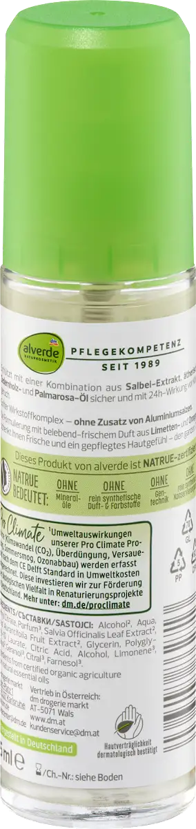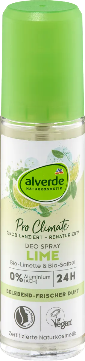 Het alverde NATURKOSMETIK Deo Verstuiver Limette & Salie 75 ml is een zachte, vegan deodorant verstuiver met een fris, citrusachtig aroma van limette (limoen) en salie die de zintuigen stimuleert en een verzorgde, aangename sensatie geeft gedurende de dag. Deze gecertificeerde natuurkosmetiek formule geeft tot circa 24 uur bescherming tegen ongewenste lichaamsgeur dankzij een combinatie van salie‑extract en andere plantaardige ingrediënten, zonder gebruik van aluminiumsalzen of andere agressieve toevoegingen. :contentReference[oaicite:0]{index=0}