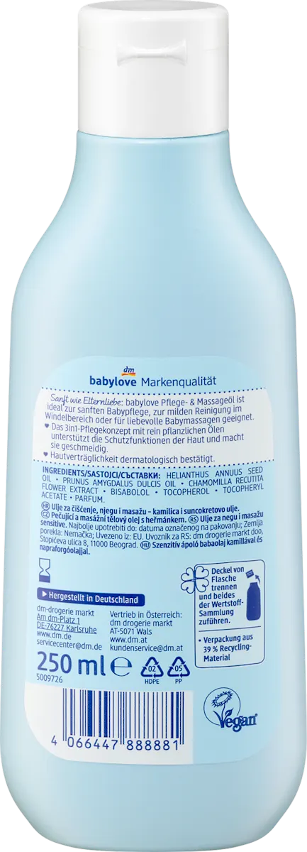 De formule bevat plantaardige oliën zoals zonnebloemolie en kamille‑extract die de huid op een zachte manier verzorgen, helpen beschermen en comfortabel maken na het baden of tijdens een massage. Dankzij het 3‑in‑1 concept ondersteunt de olie de natuurlijke huidbarrière, helpt bij regeneratie en maakt de huid heerlijk zacht en soepel.