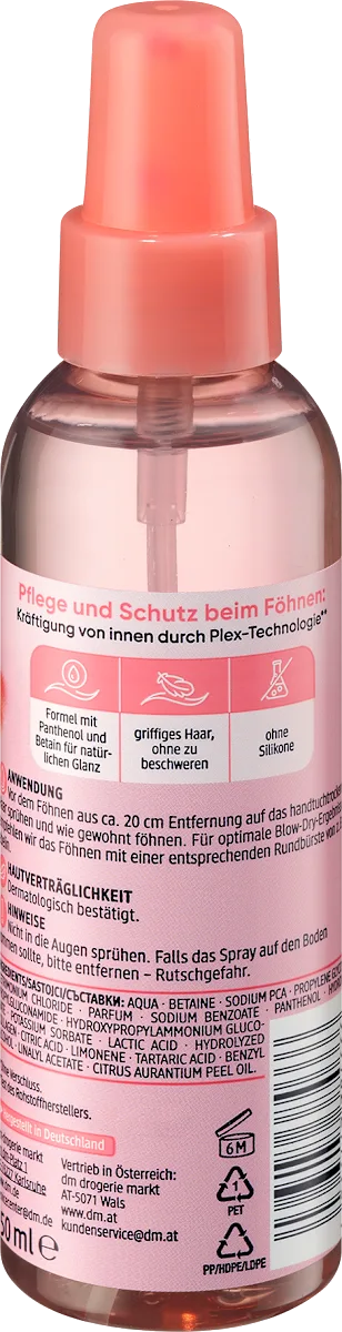 De Balea Föhn Spray Blow-Dry Föhnen & Stärken is speciaal ontwikkeld om je haar te beschermen en te versterken tijdens het föhnen en stylen. De formule biedt hittebescherming tot 230 °C en voorkomt zo schade door hitte. Inhoud: 200 ml.
