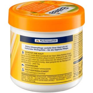Ervaar de kracht van natuurlijke verzorging met de Balea Goudsbloem Calendula Melkvet Crème. Deze hoogwaardige crème, een huismerkproduct van de Duitse voordeeldrogist DM, is speciaal ontwikkeld voor de intensieve verzorging van droge en gevoelige huid. Met het kalmerende goudsbloemextract (calendula) biedt deze crème een effectieve oplossing voor huidproblemen en zorgt het voor herstel en hydratatie.