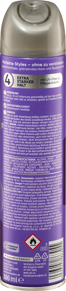 De Balea Haarspray Mystic Elegance biedt langdurige hold en een aangename geur in één product. Deze haarspray uit het assortiment van het Duitse DM-huismerk Balea zorgt voor een extra sterke fixatie (fixatiegraad 5) zonder het haar te verzwaren of restjes achter te laten. Inhoud: 300 ml.