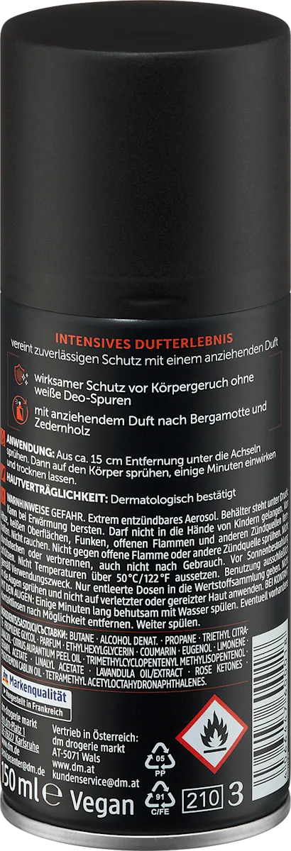De Balea MEN Deodorant Bodyspray Deep Sensation 150 ml is een verfrissende deodorantspray voor mannen met een karakteristieke houtachtige citrusgeur van bergamot en cederhout die de zintuigen prikkelt en een langdurig fris gevoel geeft. Deze deodorant‑bodyspray biedt tot ca. 24 uur bescherming tegen ongewenste lichaamsgeur en vitaliseert tegelijkertijd het lichaam — ideaal voor dagelijks gebruik. De formule is vegan en zonder aluminiumzouten, zonder parabenen, kleurstoffen of conserveermiddelen en laat geen witte of gele sporen achter op kleding.