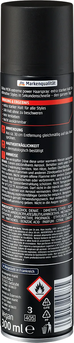 Met de Balea Men Haarspray Extreme Power blijft elk kapsel tot wel 48 uur perfect in model. Deze krachtige haarspray met holdniveau 5 is speciaal ontwikkeld voor mannen en biedt extra sterke fixatie zonder het haar te verzwaren of plakkerig te maken. Dankzij de anti-vochtformule is je styling bestand tegen weer en wind.