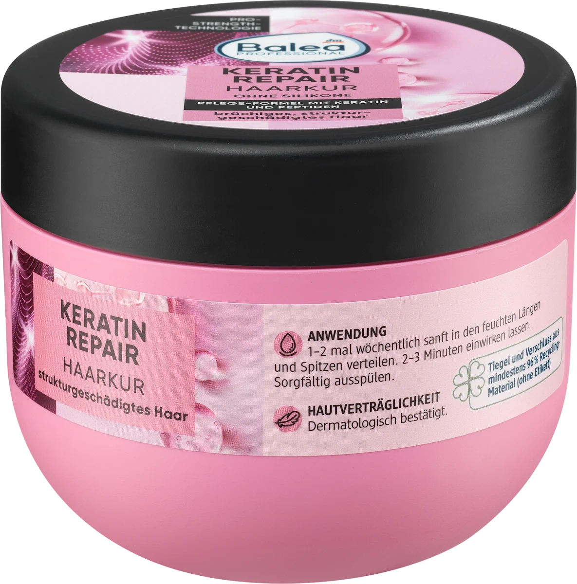 De Balea PROFESSIONAL Keratin Repair Haarkuur biedt intensieve verzorging voor beschadigd, broos of gestructureerd haar. Met een krachtige formule op basis van keratine en peptiden helpt deze kuur de haarstructuur te herstellen en de haarvezel van binnenuit te versterken. Voor voelbaar soepeler, glanzender en sterker haar – al na het eerste gebruik.