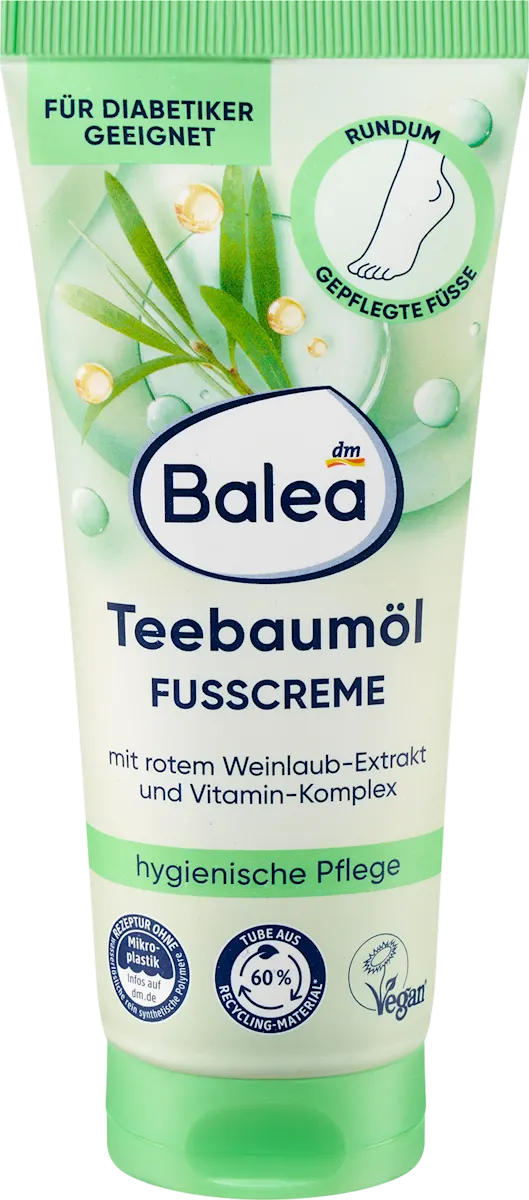 Balea Voetcrème met tea tree-olie 100 ml is een verzorgende voetcrème voor de dagelijkse verzorging van de voeten. Deze voetcrème is een huismerkproduct van de Duitse voordeeldrogist DM, die bekend staat om hoogwaardige verzorgingsproducten tegen lage prijzen.
