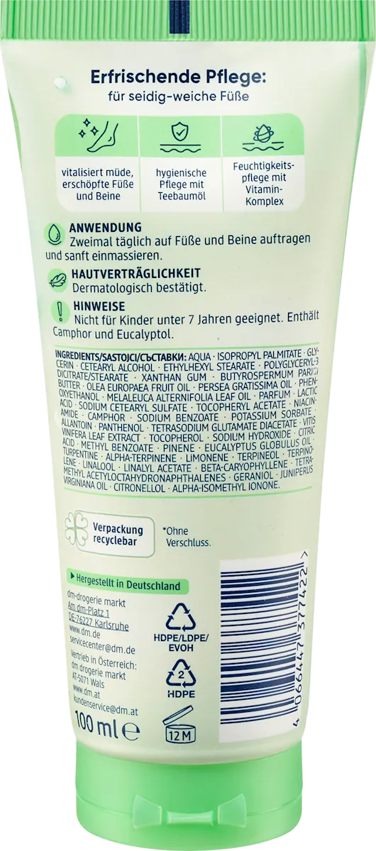 De formule bevat tea tree-olie, een ingrediënt dat veel wordt toegepast in voetverzorgingsproducten. De voetcrème ondersteunt een fris en verzorgd huidgevoel en helpt de huid van de voeten comfortabel aan te laten voelen bij regelmatig gebruik. Hierdoor is deze voetcrème geschikt voor mensen die hun voeten dagelijks willen verzorgen.