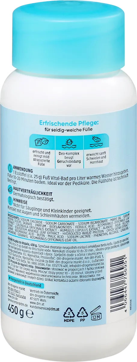 Balea is het huismerk van de Duitse drogist dm, bekend om kwalitatieve verzorgingsproducten tegen lage prijzen. Deze voetenbadformule is dermatologisch getest en combineert effectiviteit met huidvriendelijkheid. Ideaal als onderdeel van een wekelijkse voetverzorgingsroutine.