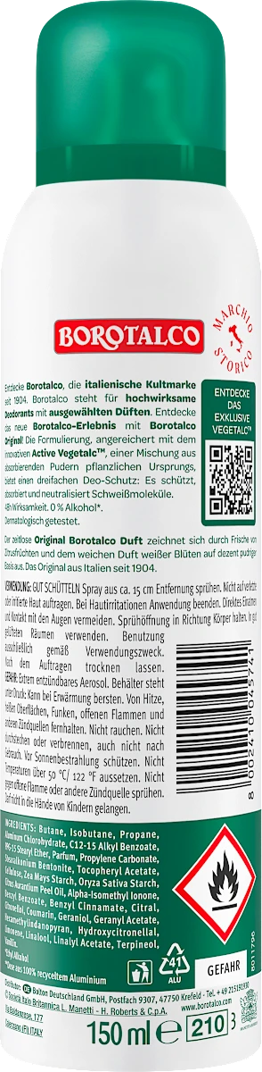 De Borotalco Original Deospray biedt tot ca. 48 uur bescherming tegen transpiratie en geur dankzij de drievoudige werking van Active Crystal Talc. :contentReference[oaicite:15]{index=15}