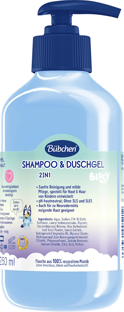 Bübchen is een vertrouwd merk voor baby‑ en kinderverzorging dat producten ontwikkelt met milde formules afgestemd op de gevoelige huid van kinderen. De 2‑in‑1 shampoo en douchgel met Bluey‑thema zorgt voor een verzorgend en plezierig reinigingsmoment zonder agressieve ingrediënten.