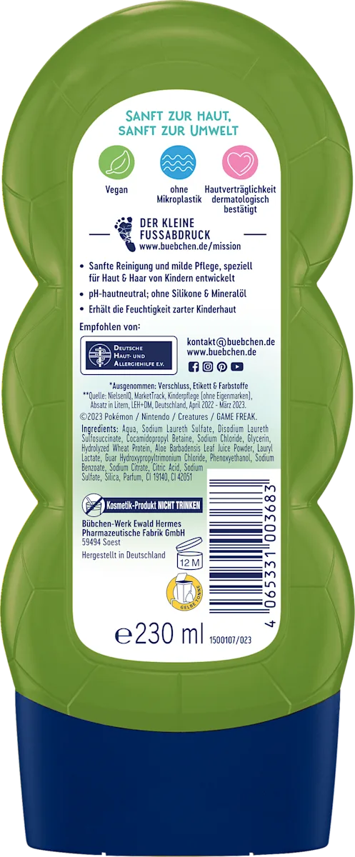 Bübchen is een vertrouwd kinder‑verzorgingsmerk dat milde, huidvriendelijke producten ontwikkelt voor de tere huid van kinderen. De Pokémon‑uitvoering van deze 2‑in‑1 shampoo & douchgel maakt het wassen aangenaam en plezierig, zonder concessies te doen aan de zachtheid en verzorgende eigenschappen.