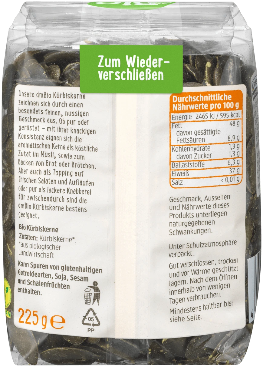 De dmBio pompoenpitten zijn een huismerkproduct van de Duitse voordeeldrogist DM, die bekendstaat om zijn hoge kwaliteit tegen lage prijzen. Deze pompoenpitten kenmerken zich door een bijzonder fijne, nootachtige smaak en zijn perfect voor diverse toepassingen in de keuken.