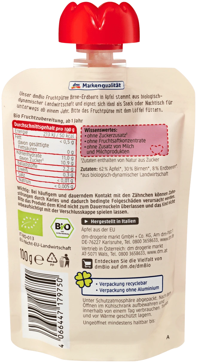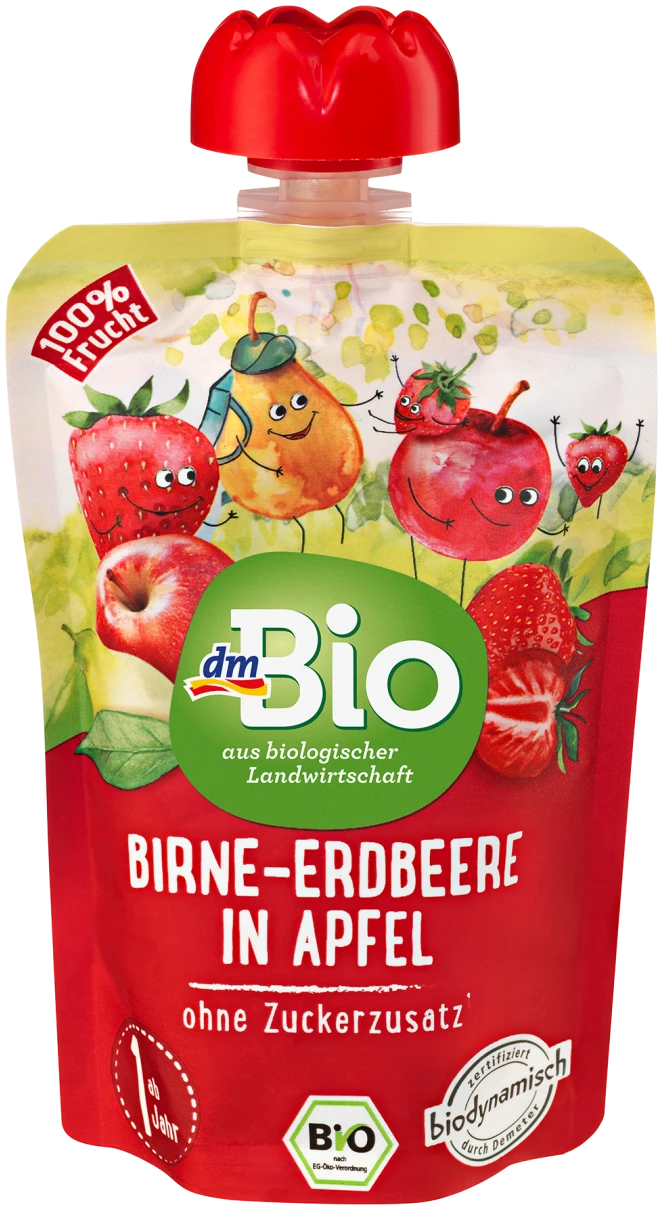 De dmBio fruitpuree met peer en aardbei is een heerlijk en gezond tussendoortje dat speciaal is ontwikkeld voor kinderen vanaf 1 jaar. Dit product is afkomstig uit de biodynamische landbouw en is een huismerkproduct van de Duitse voordeeldrogist DM, die bekend staat om zijn hoge kwaliteit tegen lage prijzen.