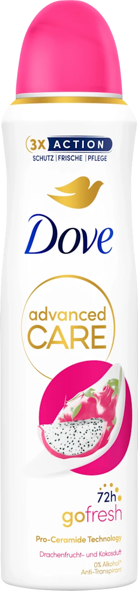 Ervaar de verzorgende frisheid van de Dove Antitranspirant Deospray Advanced Care Drachenfrucht & Kokosduft. Deze antitranspirant spray combineert een verleidelijke geur van tropische drachenfrucht en romige kokos met betrouwbare bescherming tegen zweet en lichaamsgeur. Dankzij de geavanceerde formule met Pro‑Ceramide technologie blijft je huid zijdezacht en fris aanvoelen gedurende de dag.