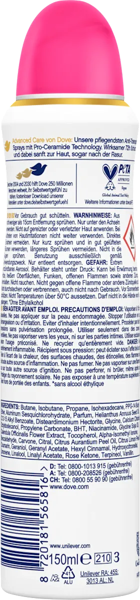 Dove staat al jaren bekend om zijn zachte en huidvriendelijke verzorgingsproducten. De Advanced Care deodorant spray biedt niet alleen bescherming, maar zorgt ook voor een verzorgd gevoel dankzij de Pro‑Ceramide technologie die de huid helpt te versterken en te beschermen tegen irritatie. De frisse drachenfrucht‑ en kokosgeur zorgt bovendien voor een tropisch gevoel dat je dag opfleurt.