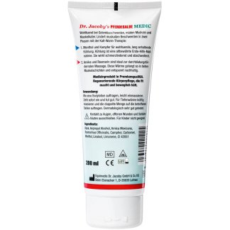 Dr Jacoby Pferdesalbe Medic is een klassiek en krachtig verkoelend verzorgingsproduct voor spieren en gewrichten. Deze spiergel met menthol kamfer arnica en rozemarijn geeft een direct verfrissend effect en ondersteunt het herstel bij spiervermoeidheid of zware belasting. Dankzij de huidvriendelijke samenstelling is het geschikt voor dagelijks gebruik op rug nek schouders benen en gewrichten.