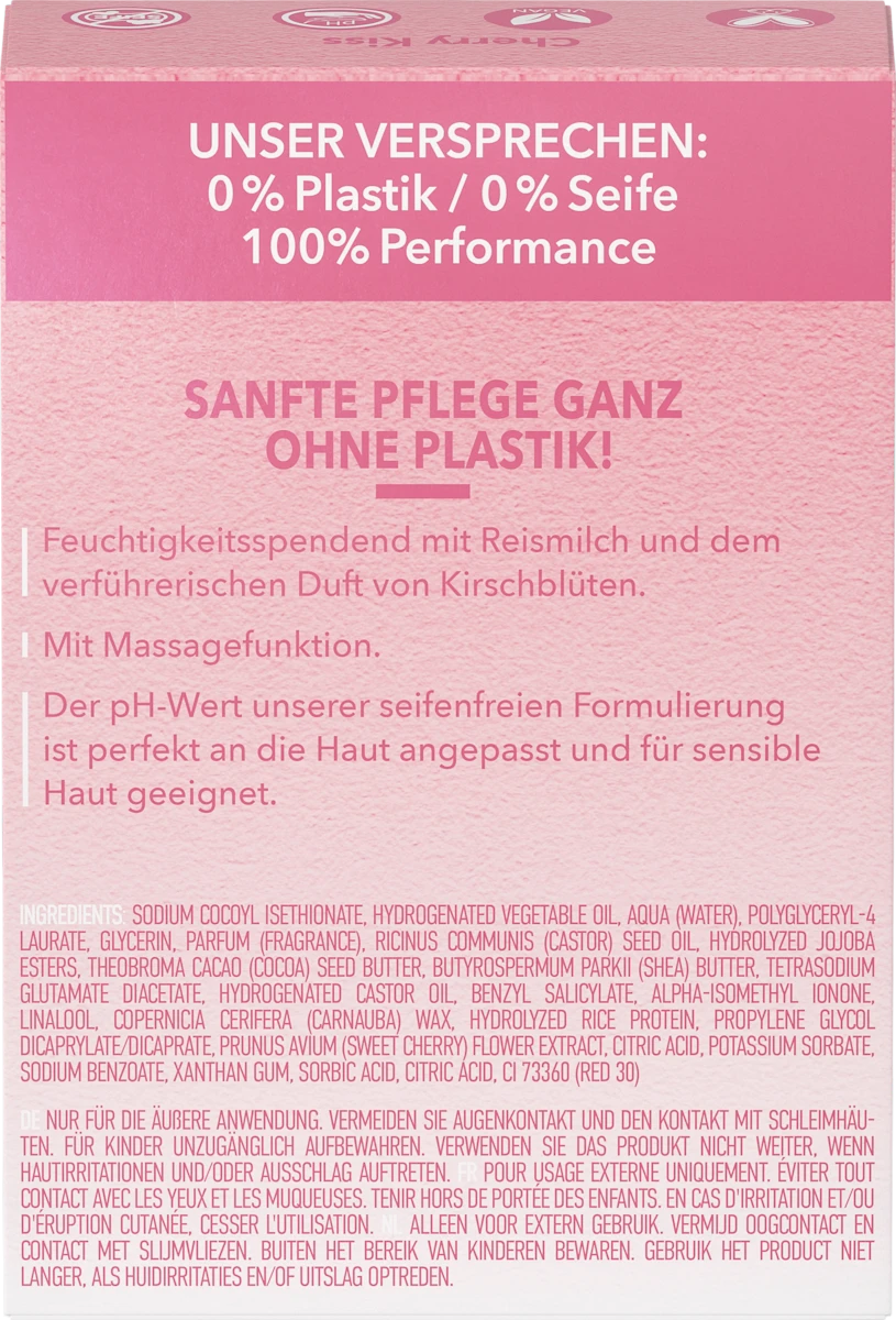 Ervaar een milde en milieuvriendelijke reiniging met het Foamie vast douchegelblok kersenbloesem en rijstmelk. Dit zero waste douchegelblok is speciaal ontwikkeld voor de normale tot droge huid en combineert de zachte geur van kersenbloesem met de verzorgende eigenschappen van rijstmelk. De formule is volledig vegan, bevat geen zeep en is pH-huidneutraal, waardoor het zacht is voor de huid.
