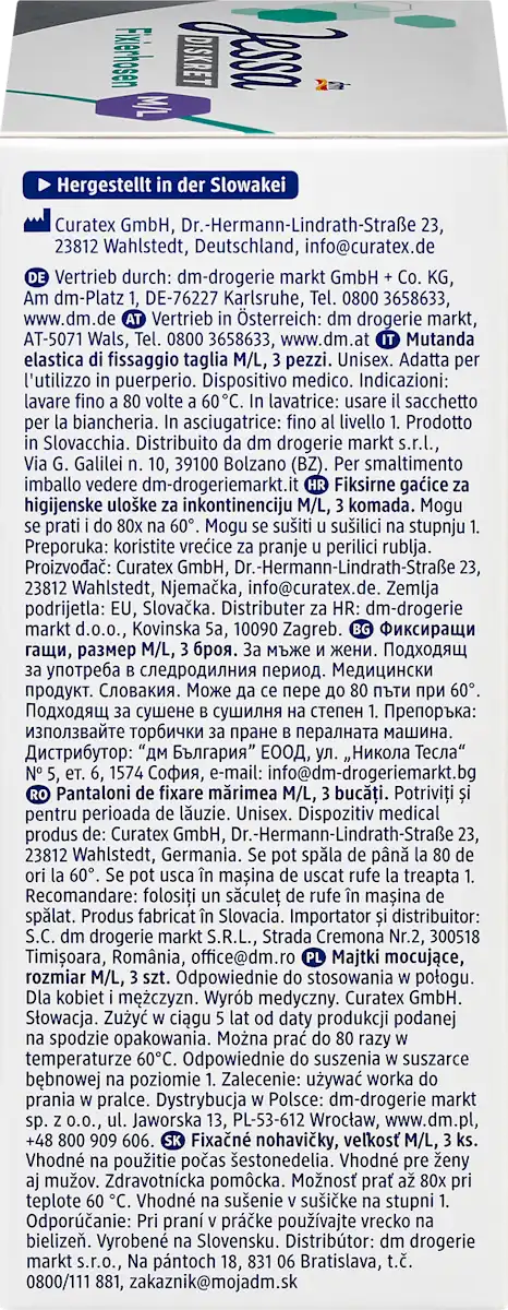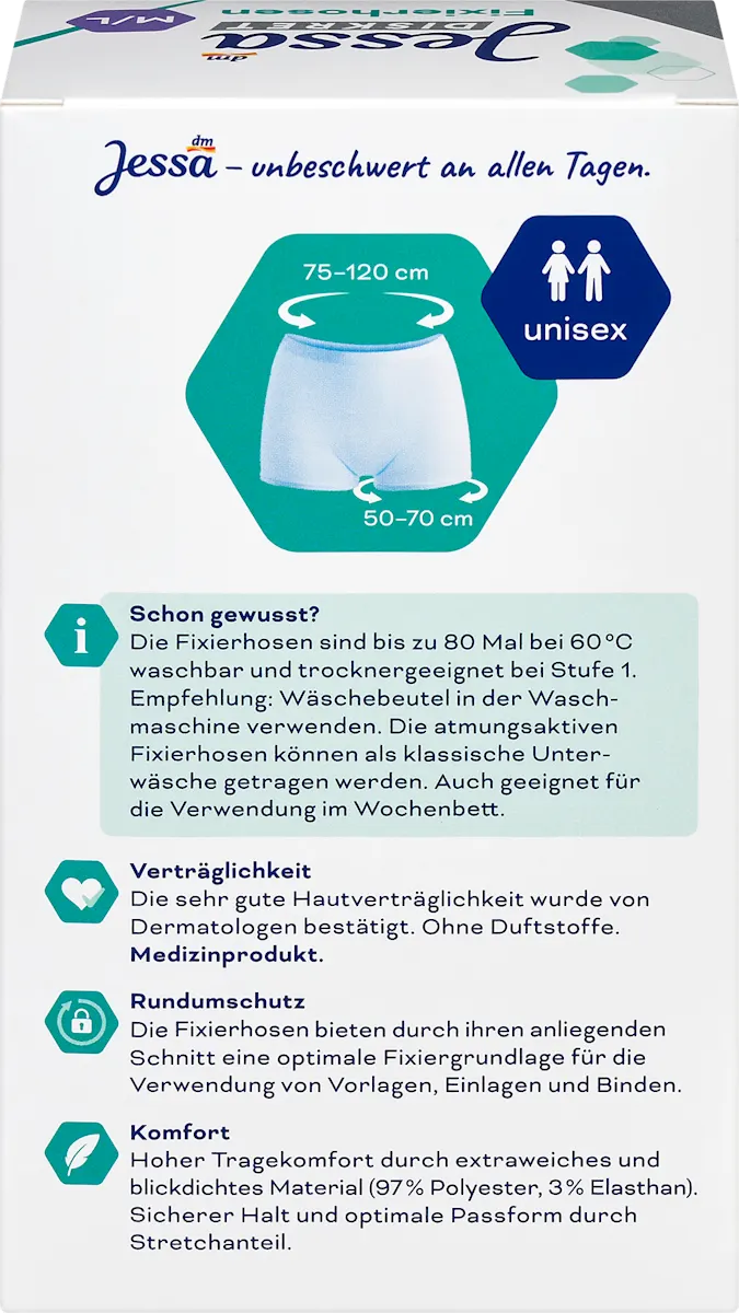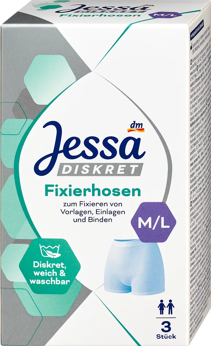 Jessa Diskret Fixierhosen in maat M–L zijn speciaal ontworpen om incontinentieverband of kraamverband veilig en comfortabel op zijn plaats te houden. Deze fixatiebroekjes zijn onderdeel van het DM-huismerk Jessa en staan bekend om hun hoge kwaliteit voor een lage prijs.