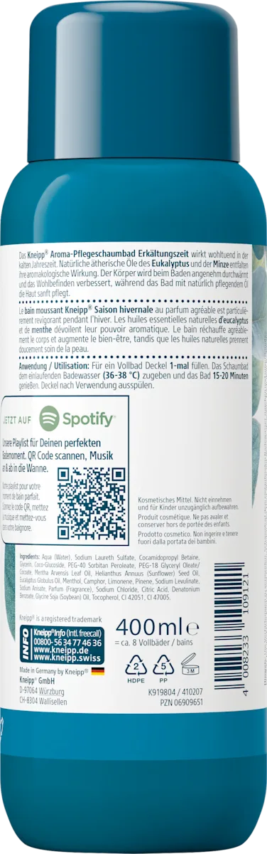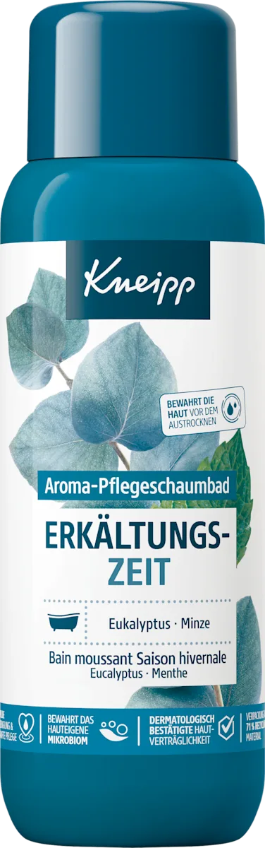 Het Kneipp Aroma‑Pflegeschaumbad Erkältungszeit 400 ml is een geurend schaumbad dat speciaal is ontwikkeld voor de koude en verkoudheidsgevoelige periode van het jaar. Dit aromatische bad combineert natuurlijke etherische oliën van eucalyptus en mint, die hun aromatische eigenschappen vrijgeven zodra je het product bij warm badwater voegt. Het resultaat is een aangenaam, verkwikkend bad waarin het lichaam gespannen spieren kan ontspannen, temperatuur en doorbloeding kan verbeteren en je welzijn merkbaar wordt gestimuleerd. De milde en verzorgende formule laat een rijk schuim achter dat zacht is voor de huid zonder deze uit te drogen. :contentReference[oaicite:0]{index=0}