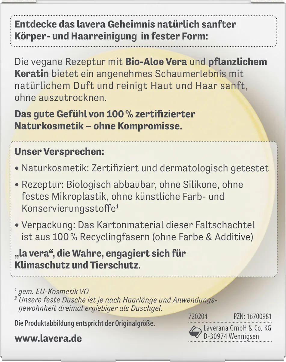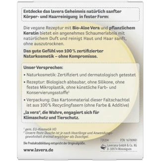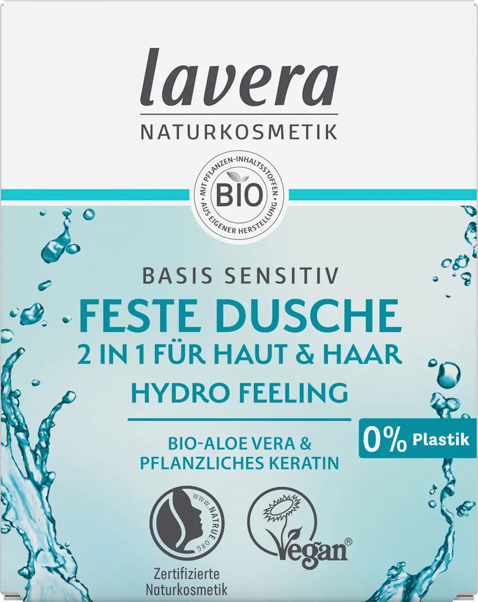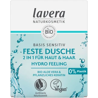 De lavera NATURKOSMETIK Vaste Douche 2 in 1 Hydro Feeling biedt een natuurlijke en zachte reiniging voor zowel lichaam als haar in één compacte vaste bar. De veganistische formule met biologische aloë vera en plantaardige keratine schuimt prettig op en reinigt je huid en haar grondig zonder uit te drogen of agressieve stoffen te gebruiken. Dit product is ideaal voor dagelijkse verzorging en draagt bij aan een duurzaam douche‑ervaring.