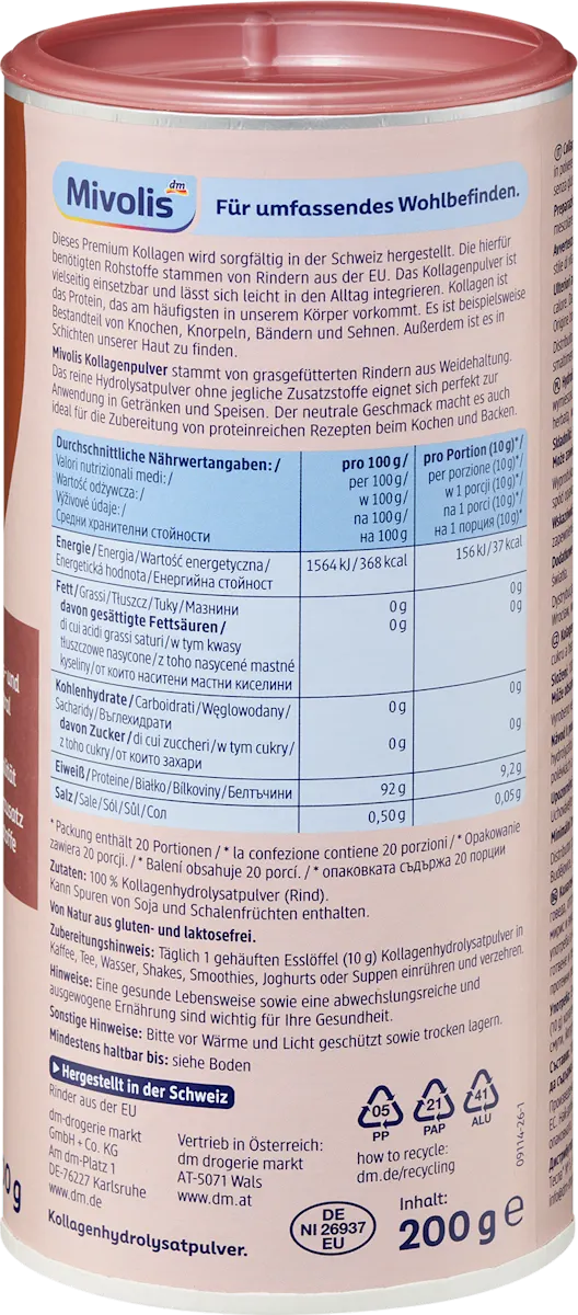 Het Mivolis collageenpoeder 200g is een krachtig supplement dat speciaal is samengesteld om jouw huid, haar, nagels, bindweefsel en kraakbeen te ondersteunen. Dit collageensupplement bevat collageen van type I, II en III en is verrijkt met belangrijke voedingsstoffen zoals vitamine C, zink en biotine. Het is een handig dagelijks poeder dat je eenvoudig toevoegt aan water, sap of smoothies.