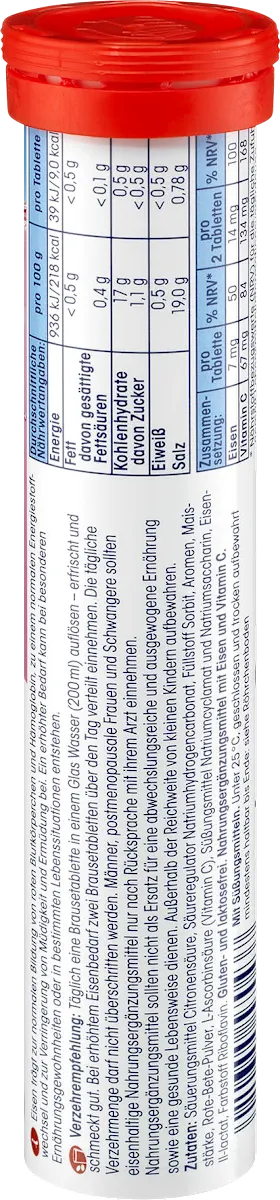 Mivolis ijzer + vitamine C bruistabletten zijn een handige en smakelijke manier om het ijzergehalte in het lichaam aan te vullen. Deze suikervrije tabletten lossen gemakkelijk op in water en hebben een aangename sinaasappelsmaak. Ze combineren 14 mg ijzer met 80 mg vitamine C per tablet – een krachtige combinatie die bijdraagt aan een normaal energieniveau en de vermindering van vermoeidheid.