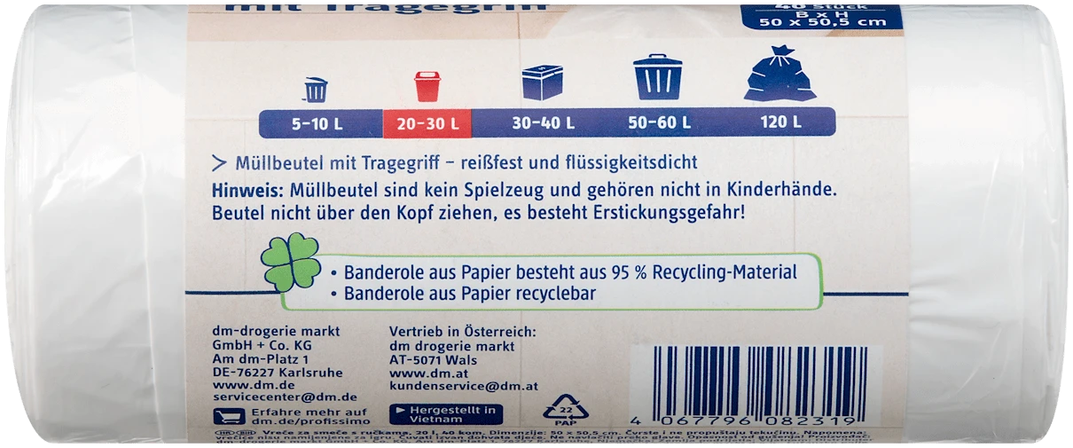 Deze afvalzakken zijn niet alleen functioneel, maar ook een slimme keuze voor het milieu. Door het gebruik van stevige afvalzakken kun je ervoor zorgen dat je afval op een verantwoorde manier wordt weggegooid. Dit product is een huismerkproduct van de Duitse voordeeldrogist DM, die bekend staat om zijn hoge kwaliteit tegen lage prijzen.