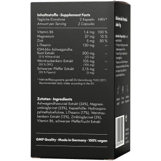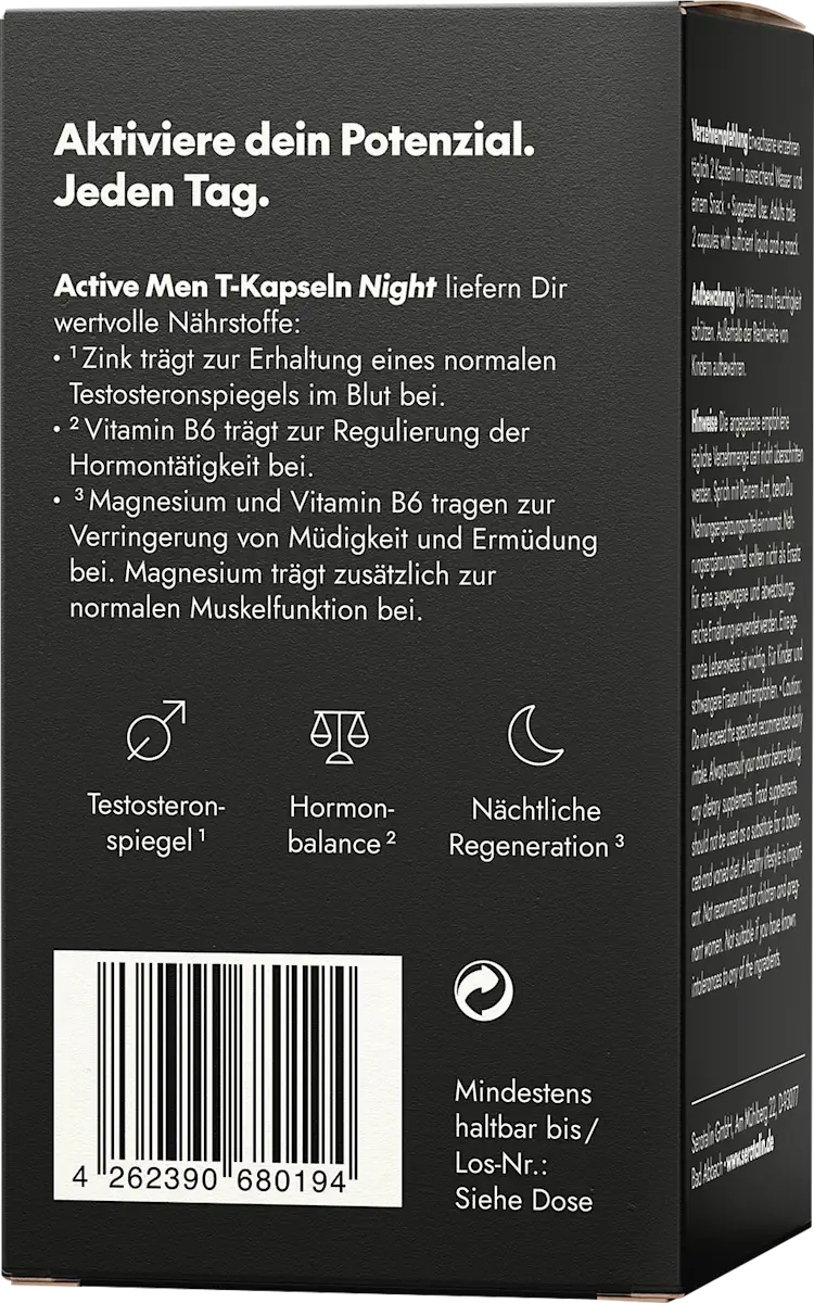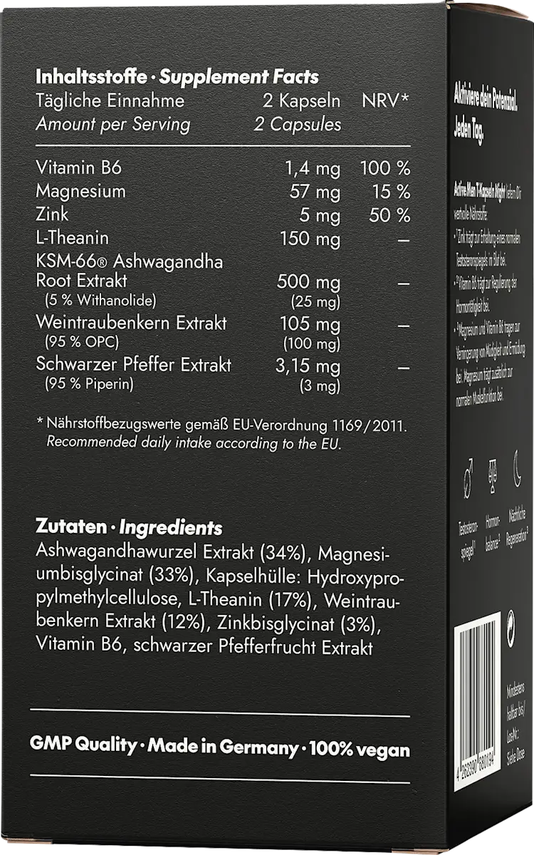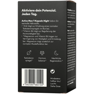 Melatonine helpt de inslaaptijd te verkorten, terwijl L-tryptofaan en ashwagandha bekend staan om hun ontspannende eigenschappen. Zink speelt een rol in het behoud van een normaal testosterongehalte in het bloed en vitamine B6 ondersteunt de regulering van hormonale activiteit. Samen zorgen deze ingrediënten voor herstel van lichaam en geest tijdens de nacht – precies afgestemd op de behoeften van mannen.