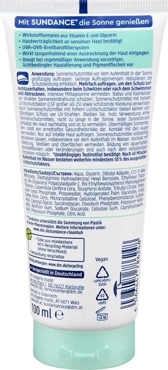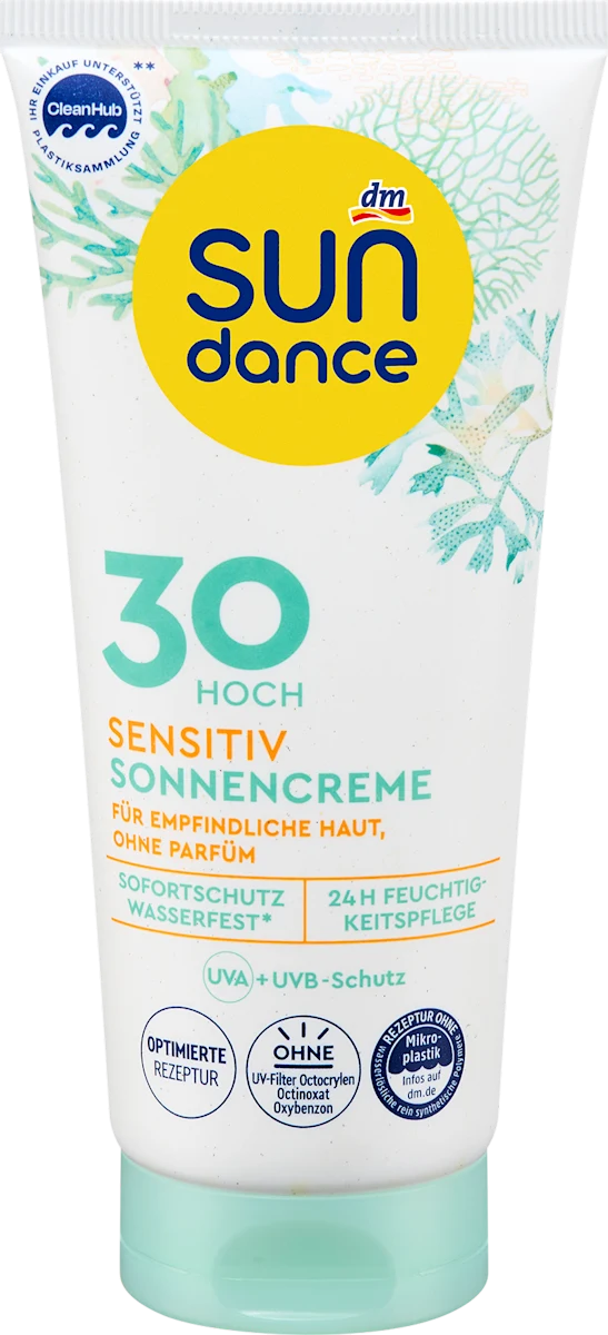 SUNDANCE zonnecrème sensitiv SPF 30 100 ml is een zonbeschermingsproduct dat speciaal is ontwikkeld voor de dagelijkse bescherming van de gevoelige huid. Deze zonnecrème maakt deel uit van het SUNDANCE assortiment van de Duitse voordeeldrogist DM, die bekend staat om betrouwbare en betaalbare zonverzorgingsproducten.