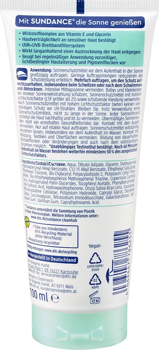 SUNDANCE zonnecrème sensitiv SPF 50 100 ml is een zonbeschermingsproduct dat speciaal is ontwikkeld voor de dagelijkse bescherming van de gevoelige huid tegen zonnestraling. Deze zonnecrème maakt deel uit van het SUNDANCE assortiment van de Duitse voordeeldrogist DM, die bekend staat om betrouwbare en betaalbare zonverzorgingsproducten.