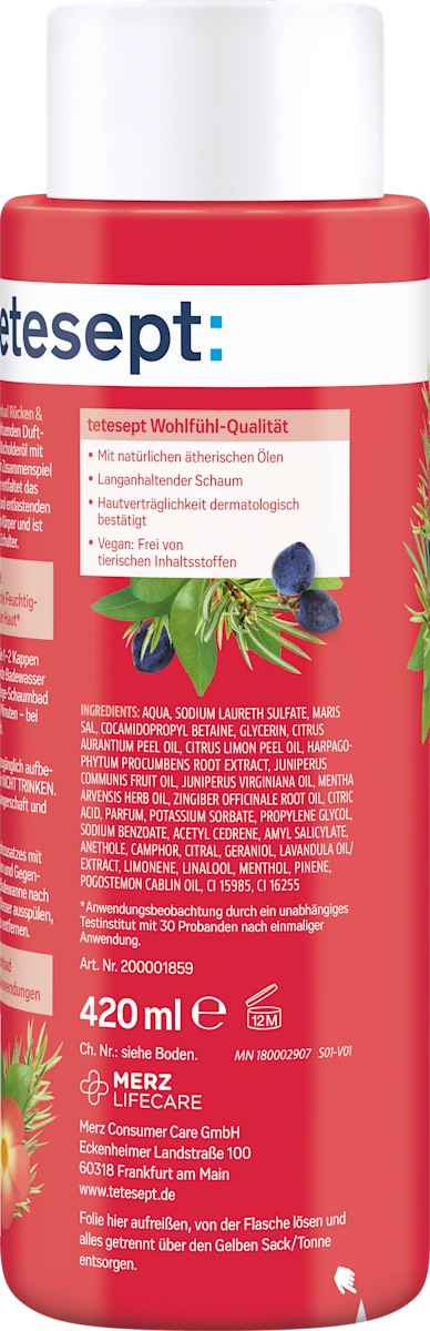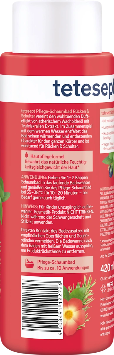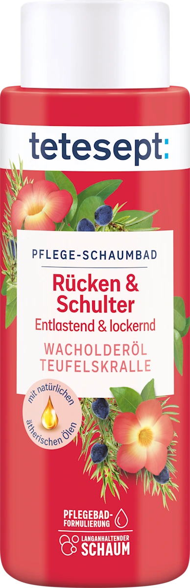 Het Tetesept Schaumbad Rug & Schouder 420 ml is een verzorgend badschuim dat speciaal is ontworpen om je te helpen ontspannen na een lange dag, met een focus op rug‑ en schoudercomfort. Dit badproduct bevat een harmonieuze combinatie van natuurlijke etherische oliën, waaronder onder andere wacholderolie, citrusextract en gemberolie, samen met Teufelskralle‑extract. In combinatie met warm badwater ontwikkelt het een aangename geur en een warm, ontspannend gevoel dat zich over het hele lichaam uitstrekt. Het resultaat is een rijk en langdurig schuim dat je huid omhult en een moment van pure rust en wellness biedt. :contentReference[oaicite:0]{index=0}