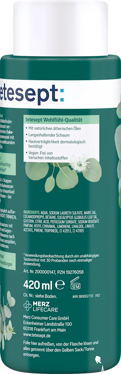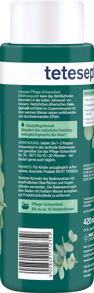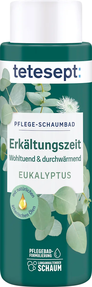 Het Tetesept Schaumbad Verkoudheidstijd 420 ml biedt een aangename en verzorgende badervaring, vooral geschikt in de koude maanden of na een vermoeiende dag. Dit verzorgende schaumbad is verrijkt met natuurlijk etherische eucalyptusolie die in combinatie met warm water zijn warme, verkwikkende effect vrijgeeft. Het resultaat is een rijk en langdurig schuim dat je huid omhult en helpt je lichaam en geest te ontspannen terwijl de frisse, kruidige geur voor een wellness‑gevoel zorgt. :contentReference[oaicite:0]{index=0}