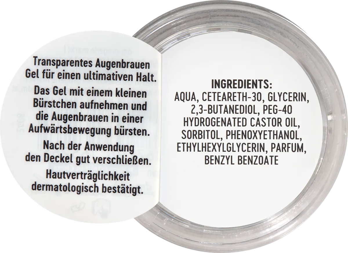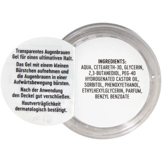 Haal wat gel met het borsteltje uit het potje en breng het aan op je wenkbrauwen in een opwaartse beweging. Style de haren zoals gewenst — de transparante formule fixeert ze stevig terwijl ze natuurlijk blijven aanvoelen. :contentReference[oaicite:1]{index=1}