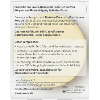 In winkelwagen<ul> <li>Vaste douche‑ en haarreiniger 2 in 1 met verfrissende geur</li> <li>Met biologische aloë vera en plantaardige keratine</li> <li>Vegan, pH‑neutraal en milde verzorging</li> <li>Biologisch afbreekbare formule zonder silicones en microplastics</li> </ul>